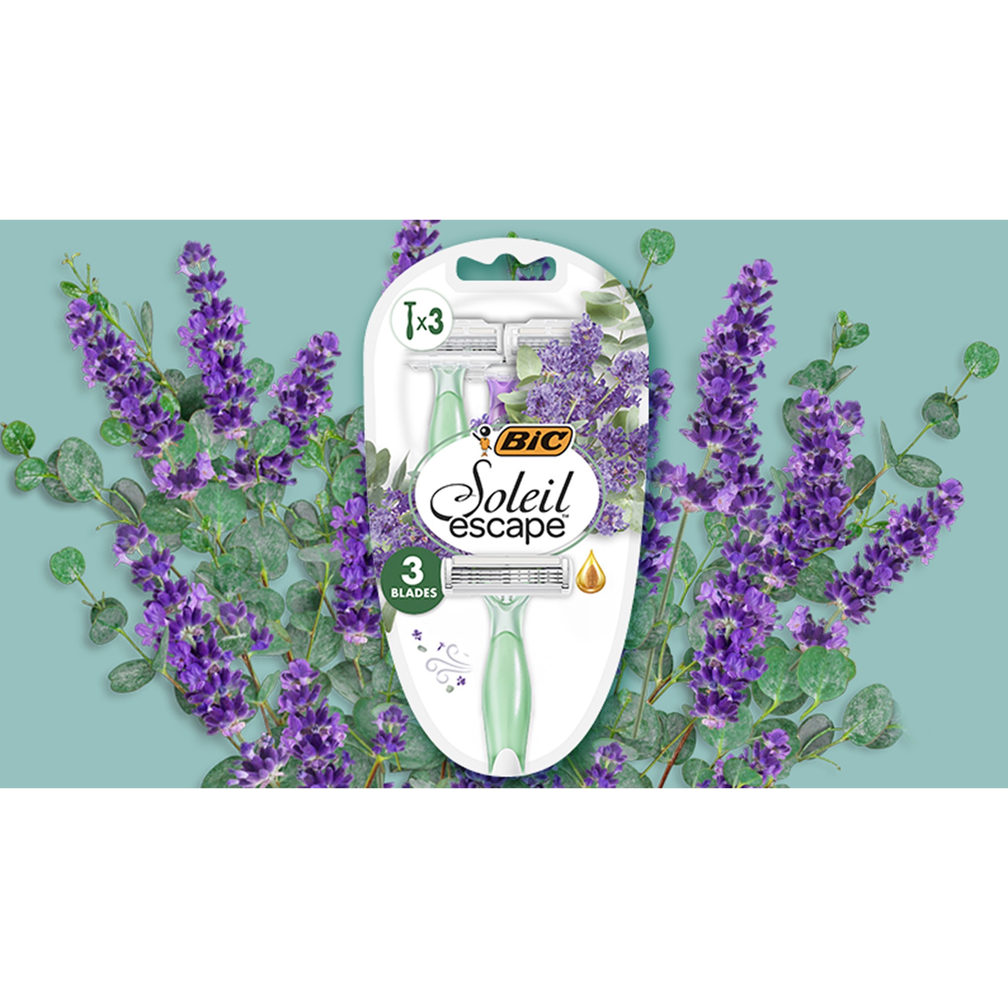 - BIC Soleil Escape Λεβάντα & Ευκάλυπτος, σε συσκευασία 3 γυναικείων ξυριστικών με 3 κινητές λεπίδες μεγάλης διάρκειας και εξαιρετική ολίσθηση.